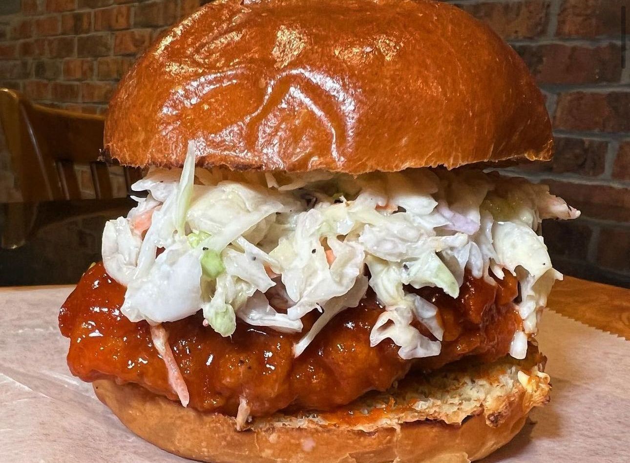 Crispy chicken breast coated in buffalo sauce,topped with creamy coleslaw.
