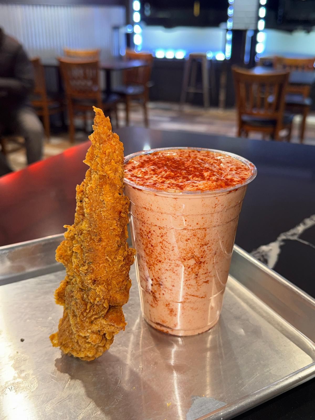 Crispy fried chicken topped with creamy macaroni and cheese.